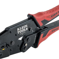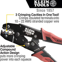 The full-cycle Ratcheting Crimper crimps 10-22 AWG insulated wire terminals. This tool features three crimping cavities in one tool with color-coded wire markings for three size ranges of insulated terminals. Crimper design provides low effort to crimp while maintaining a high terminal pull-off force. Built-in ratchet ensures full-cycle crimping for a uniform crimp every time. Compound lever-action of narrow-span handles puts more crimping power into each squeeze. Comfort grips help reduce hand fatigue. For more than 160 years, Klein Tools has manufactured premium-quality, professional-grade hand tools that deliver the performance, durability and precision needed to get the job done right. Our family of engineers, workers and craftsman continue to put six generations of expertise into every tool we create by using only the highest quality materials, superior workmanship, and keeping manufacturing as close to home as we can. Klein isn't just the name of our company, it's also our family name. And since we're an American company that's family-owned and family-run, you know you can count on us to be here tomorrow. Klein Tools doesn't just make great products, we make great products that stand up to the demands of the professionals who use them every day ... Since 1857.