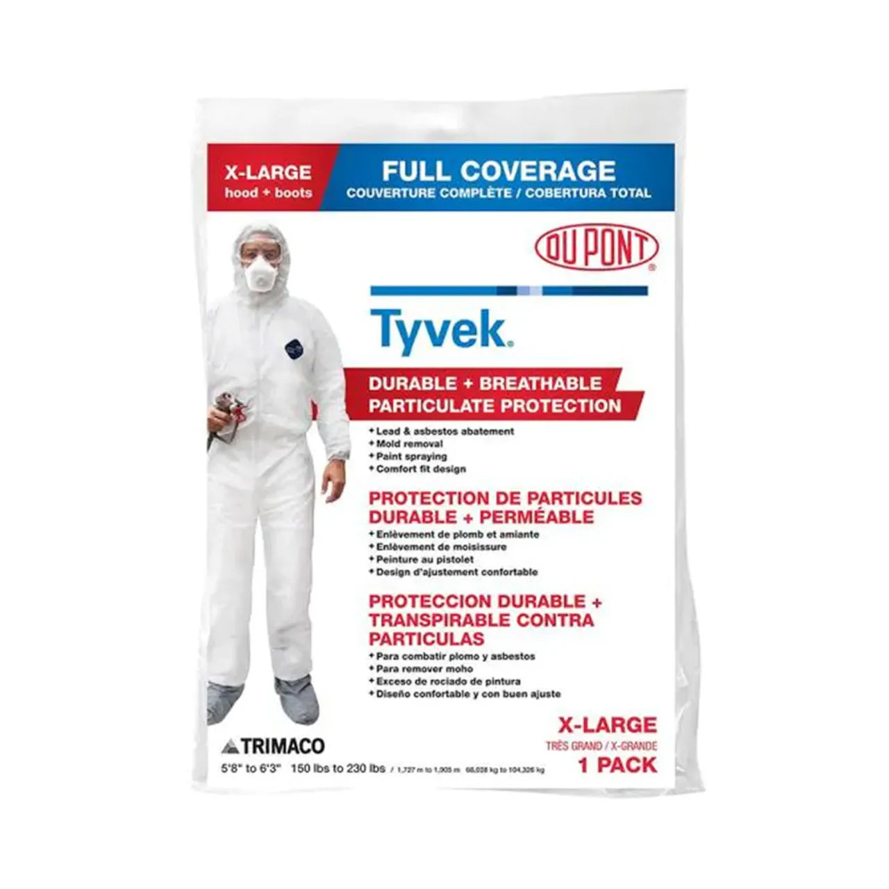 TRIMACO Tyvek coveralls deliver full-body protection for construction, renovation, and hazardous material work. This XL suit features an integrated hood and boot covers for complete coverage without additional gear. The lightweight, breathable Tyvek material resists tears and punctures while allowing air circulation for all-day comfort. Elastic wrists and ankles create a secure seal against dust, chemicals, and particles. Ideal for contractors tackling demolition, asbestos removal, painting, or contamination control. One-piece design speeds up dressing and ensures no exposed skin during critical jobs.